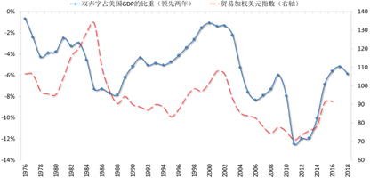 第二,美国内部来看,双赤字施压美元。据测算,美国财政赤字与贸易赤字占GDP的比重领先贸易加权美元指数约两年左右,而贸易加权美元指数与美元指数走势趋同。当前,特朗普税改已取得明显进展,保守估计,税改的落地将在未来十年内至少增加美国财政赤字1.4万亿美元左右。大规模的财政支出将导致美国财政赤字的增长速度将明显快于GDP增速。图形上看,双赤字占GDP的比重已呈现扩大迹象,相应给美元压力增加。(图1)