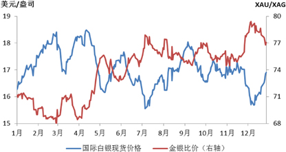 白银投资需求低迷,供给过剩,基本面弱于黄金,且2017年全球通胀走势整体低迷,也令商品属性较强的白银受累,整体走势显著弱于黄金,短期价格波动则与黄金大体相同,共同受宏观因素驱动。金银比价大幅上涨,最高至79上方。一季度,全球通胀上行,白银涨幅与黄金相当,金银比价震荡回落,最低至68附近。二季度以来,全球通胀走势持续低迷,COMEX白银期货投机性净多头持仓大幅下滑,ETF持仓下半年也持续回落,白银走势持续低迷,年内两度跌至16美元/盎司下方,金银比价在12月初升至年内高点。