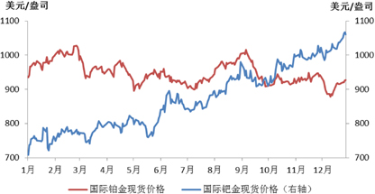 铂钯需求的分化从2016年延续到2017年,钯金需求缺口维持高位,年内持续上涨,铂金走势相对低迷,自2016年四季度以来持续横向震荡。