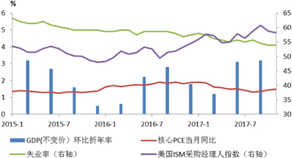 美国经济增长提升,通胀走势相对低迷。经济增长的结构改善,投资和出口取得良好增长,对GDP增长的贡献也显著提升,这与特朗普政府的经济政策目标一致。消费者信心指数保持高位,消费增长依然稳健。制造业景气上升,ISM制造业PMI指数和新订单指数持续上行。就业保持良好,接近或处于充分就业,非农就业增长整体强劲,失业率进一步回落至4.10%的低位。通胀走势相对低迷,一季度之后核心PCE物价指数同比增速逐渐回落至1.40%附近,四季度小幅改善,但仍显著落后于美联储通胀预测和2016年水平。