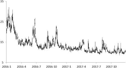全球央行货币政策逐渐转向收紧。2017年,加拿大央行先后在7月和9月各加息25个基点,英国央行11月加息25个基点。欧央行在12月会议决定将购债规模从600亿元缩减至300亿元,时间持续至明年9月,购债规模的缩窄推动了利率上升,欧央行部分执委已表态支持明年结束购债。中国则收紧了金融市场流动性,持续推动金融部门去杠杆,市场利率维持在较高水平。