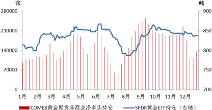 图7 SPDR黄金ETF和COMEX黄金期货非商业净多头持仓