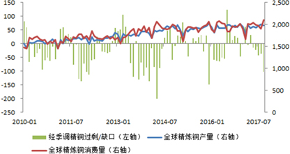 2017年铜市场基本面大幅好转,前三季度基本处于供不应求格局。根据国际铜业研究组织(ICSG)数据,前9个月供给缺口累计13.2万吨,超过2016年同期11.3万吨供给缺口。(图2)