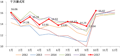 2.房地产行业基本持稳。2017年前11月,房地产市场新开工累计面积同比增长6.9%,接近去年同期增速水平。目前房地产销售已明显回落,中期拐点明显。国家提出“房住不炒,租购并举”重要政策方向,预计2018年影响将显现,房地产投资增速明显回落。
