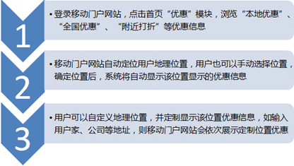 移动门户网站推出“优惠”模块,整合建行线上线下优惠信息,优惠类型涵盖附近打折、满减优惠、价格优惠、返现优惠、0元购、电子券优惠等多种类型。移动门户网站根据用户地理位置(LBS)提供本地优惠服务,用户可以自动定位或手动选择所处城市,查看该地区优惠活动信息。此外,用户可以自定义周边优惠信息,如定义“公司”,添加公司地址,移动门户首页将展示用户所处公司附近优惠活动。