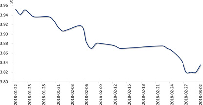 债券市场:上周前四个交易日央行公开市场净投放1400亿,且受一级市场配置需求旺盛、2月官方制造业PMI低于市场预期、隔夜美债收益率下行等因素影响,10年期国债收益率下行。后由于央行公开市场小幅净回笼,且有消息称资管新规或于近期发布,带动10年期国债收益率上行。截至上周五,10年期国债收益率较前一周小幅下行3BP至3.84%。