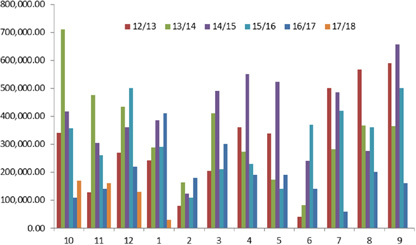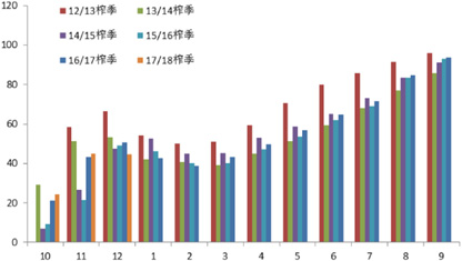 中糖协的报告数据显示,2017/18榨季截至1月末全国共产糖512.66万吨(上制糖期同期产糖453.96万吨),同比增加58.7万吨;其中1月单月全国产糖280.3万吨(上制糖期同期产糖224.3万吨),同比增加56万吨。1月份,广西产混合糖187.6万吨,同比增加30.6万吨;产糖率11.39%,同比下降0.35个百分点。云南产糖37.42万吨,同比增加8.23万吨,出糖率11.80%,同比提高0.11%。从数据可以看出,广西出糖率下降,不过1月份产量同比增加较多。中糖协的报告数据显示,2017/18榨季截至1月末全国共销糖239.86万吨(上制糖期同期销糖193.82万吨),同比增加46.04万吨;1月份产销率46.79%(上制糖期同期产销率42.7%),同比增加4.09个百分点。其中1月单月全国销糖136.03万吨(上制糖期同期销糖77.11万吨),同比增加58.92万吨。1月份在产量和销量同步增加,产销率增加说明总体销售情况还是可以的。中糖协的报告数据显示,截至1月底,全国食糖工业库存272.8万吨(上制糖期同期库存260.14万吨),同比增加12.66万吨。(图8)