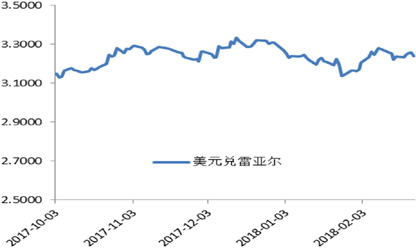 2月份美元指数经历了一波三折的筑底反弹,在88一线构筑了双底形态,雷亚尔、泰铢汇率都明显走弱。美元兑雷亚尔月初在3.1724,月末涨至3.2411,美元兑泰铢月初在31.0936,月末涨至31.2273。根据美联储去年12月会议的“点阵图”,决策者的利率预期中值为2018年加息三次。但是,由于近期公布的美国经济数据强劲,尤其是1月薪资与通胀数据表现强劲,这令市场预期对今年的加息次数预期转向四次。对通胀在停滞了很长时间后上升的担忧,提高了美联储可能在今年和明年收紧政策程度大于预期的可能性,这提升了美债收益率和美元。1月份美国国债收益率不断上升,其中10年期国债收益率升至2.7%以上,创下自2014年4月以来的最高水平。美国国债收益率上升,往往会使美元更具吸引力。(图10)