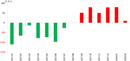 通胀方面,CPI明显提高,2月CPI同比2.9%,春节错位是CPI同比大幅回升的主要因素,同时由于寒冷天气导致鲜菜鲜果等价格超预期回升、猪肉价格同比跌幅收窄等因素亦对CPI形成正面拉动。PPI如期回落。由于2月主要大宗商品价格均有所下滑,带动生产资料负增0.1个百分点导致PPI环比负增0.1%,2018年2月PPI同比继续回落至3.7%。整体而言,2018年通胀压力不大。
