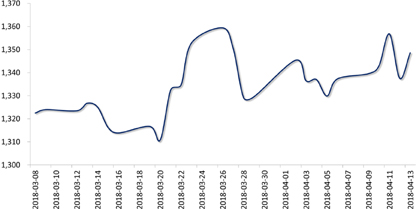 上周,特朗普宣布并实施对叙利亚武装打击,避险需求推动黄金价格大幅走高。截至上周收盘,COMEX黄金期货价格较前一周上涨0.84%至1348.60美元/盎司。