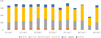 本月共有36家证券公司或其子公司发行了613款资管产品,环比增加282款,升幅为85.20%,平均首发规模8.24亿元,环比增加4.18亿元,升幅为102.66%。其中,债券型产品发行了375款,环比增加178款,升幅为90.36%,平均首发规模7.50亿元,环比增加2.09亿元,升幅为38.53%;货币市场型产品发行了161款,环比增加69款,升幅为75.00%,平均首发规模0.71亿元,环比减少0.36亿元,降幅为33.51%;FOF产品发行了29款,环比增加28款,升幅为2800.00%,平均首发规模48.34亿元,环比增加42.34亿元,升幅为705.63%;混合型产品发行了22款,环比增加9款,升幅为69.23%,平均首发规模8.85亿元,环比增加7.35亿元,升幅为490.00%;QDII产品发行了2款,环比增加1款,升幅为100.00%;股票型产品发行了1款,环比持平,平均首发规模50.00亿元;其他型产品发行了18款,环比减少1款,降幅为5.26%。(图9)