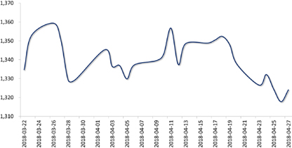 上周,受美债收益率持续上行、美元指数反弹影响,国际金价承压下挫;此外,朝鲜半岛紧张局势出现重大缓和,市场避险情绪降温,也打压金价。整体上,国际金价震荡走弱,一度触及五周低点,COMEX期金周五收于1324.10美元/盎司,当周累计下跌1.01%。