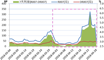 月内资金利率先下后上。月初资金需求减少,资金利率明显回落,在4月8日降至月内低点2.74%。4月15日开始利率明显上行,由于4月缴税的规模可能高达上万亿,加上地方政府债券发行放量缴款、市场交易机构加杠杆等因素影响,资金需求大幅增加。央行在4月17日宣布降准1%,17-24日期间市场的资金需求集中到短端,7天回购利率大幅上行,在4月24日达到月内高点6.16%。后随着降准增量资金的释放和月末财政支出力度的加大,资金利率逐步回落。
