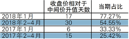 然而,今年的情况明显发生了变化。1月,人民币升值3.5%,在22个交易日中,有17个交易日的收盘价在中间价的升值方向;进入2-4月的区间震荡后,也有约一半左右的交易日收盘价较中间价升值。当前人民币已出现明显的双向波动状态。(表1)