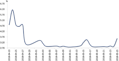 货币市场:由于月末临近,加之5月底前企业需要清缴上年度企业所得税,7天回购利率震荡上行。截至上周五,7天回购利率较前一周上行75BP至3.57%。