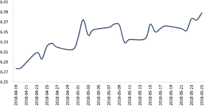 上周,欧洲经济数据疲弱,市场对欧央行退出宽松的预期进一步降温,打压欧元,推动美元上涨。但随后美联储公布偏鸽派的会议纪要,加之特朗普一度扬言要取消与金正恩的会面,令美元涨势放缓,周五收于94.27,当周累计上涨0.62%。在客盘结汇需求支撑下,人民币汇价跌幅相对较小,周五收于6.3891,当周累计下跌0.21%。