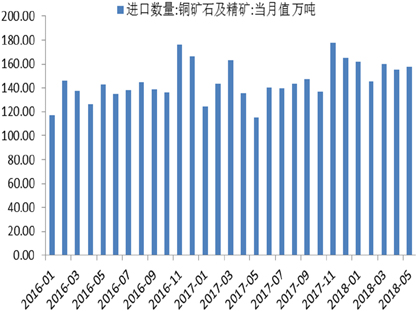 2018年5月国内精炼铜产量63.8万吨,1-5月国内精炼铜累计产量362.3万吨,同比增长11.1%,5月当月产量362万吨,环比下降18%。5月国内精炼铜产量下滑,主因粗铜和废铜原料供应紧张;另外有些铜企由于设备故障而进行关停检修,从而使5月产量环比下降明显。当然市场消费开始表现走弱,也是影响因素。6月企业检修力度加大,粗铜供应紧张格局较为明显,加上废铜供应紧缺,因此精铜企业产出势必受到影响。另外6月市场消费开始正式进入淡季,市场消化精炼铜库存有限,预计冶炼企业6月产出环比持续下降。