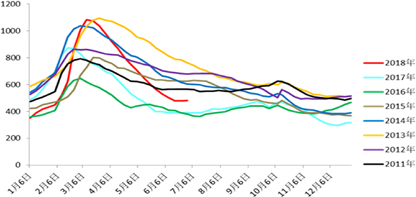 与螺纹钢、焦炭、焦煤等黑色系期货相比,2018年上半年铁矿石期货整体上表现偏弱。一方面,铁矿石自身的基本面不佳,特别是在国际四大铁矿石生产商继续增产、中国铁矿石进口量继续增加、中国港口铁矿石库存连创新高情况下,铁矿石供应宽松的同时,国内钢铁去产能、部分地区采暖季和非采暖季限产、环保“回头看”、蓝天保卫战等政策措施,对铁矿石需求构成制约,铁矿石价格明显回落后反弹乏力。