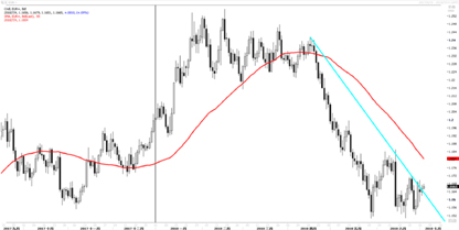 从周线图来看,去年至今年4月以来形成的上涨通道已破坏,趋势反转走势正在确立。从大势上看,2008年至今的下跌通道上轨仍完美压制欧元兑美元的反弹高度,上方阻力在年初高点1.2550,下方支撑在1.1500,同时200周均线亦构成支撑。在欧元区数据出现趋势性好转之前,难以见到欧元大幅反弹。同时我们判断贸易战以及其代表的逆全球化局面短期内不会消除,对欧元区经常项目构成压力。基于以上判断,我们预计下半年欧元下行压力持续存在,上方反弹空间受限。走势预计先跌后涨,反弹最早可能出现在今年年末。预计整体波动区间为【1.12,1.20】。(图3)
