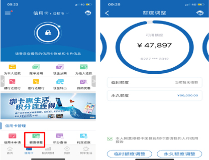 95533答:可以。您关注“中国建设银行”官方微信,并绑定信用卡后即可申请调整。申请流程为:进入建行官方微信,在首页依次点击“信用卡-账单/还款/额度管理”,回复序号选择“额度管理”,按页面提示操作即可。除微信银行外,您还可通过我行个人网银、手机银行申请信用卡永久额度调整。