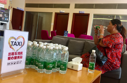 正在建行昆明体育城支行休息喝水的出租车司机张师傅