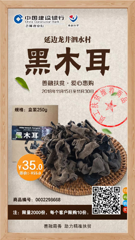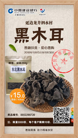 “你知道吗?建行客户购买善融扶贫泗水村木耳产品,可享折扣优惠呢!”