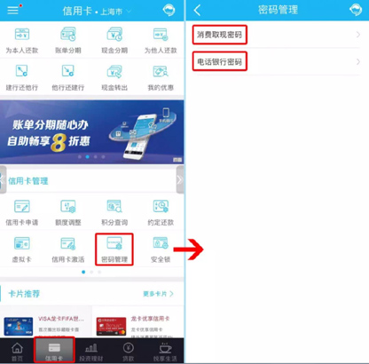 登录“中国建设银行”手机银行,在信用卡菜单点击“密码管理”,可修改/重置交易密码。