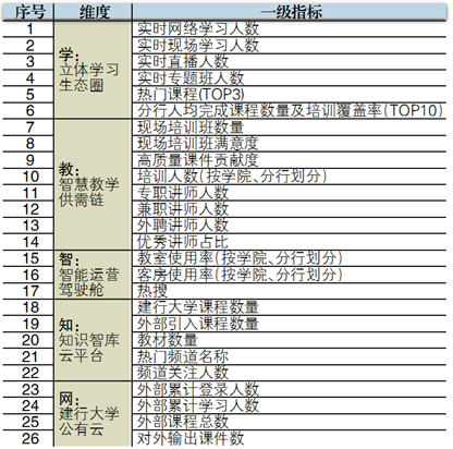 1.KPI监控评价体系。围绕“学、教、智、知、网”(LEARN)五个维度,构建26项一级指标。(表1)