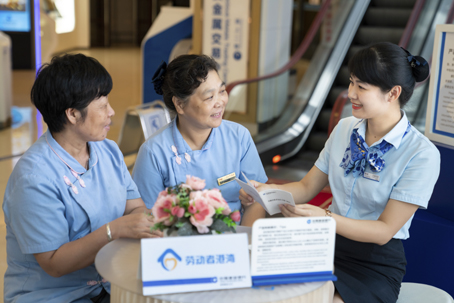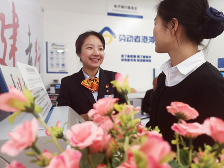 福建省福州城东支行营业室员工在"劳动者港湾”专区为客户提供温馨服务的同时为客户普及金融知识,互动交流充满了欢声笑语。