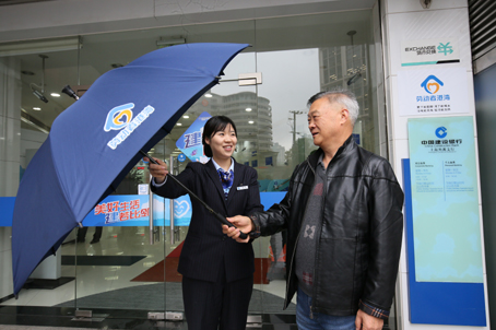 王老伯是一位上海市外滩支行的老客户,来网点办完业务后,外面淅淅沥沥下起了雨。正当他一筹莫展时,大堂经理给递上了劳动者港湾的爱心伞,让王老伯心头暖暖的。
