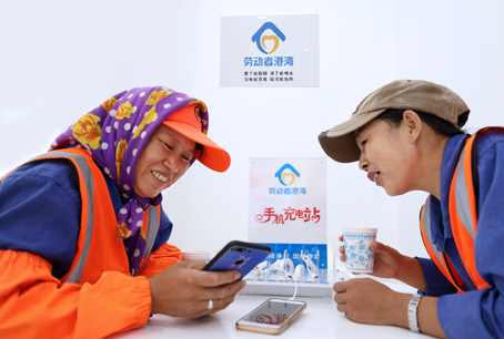 环卫工人在“劳动者港湾”为没电的手机充电,开心地说:“现在可好了,在‘劳动者港湾’不仅能休息热饭,而且随时可以给手机充电,还能免费使用无线网络。真心感谢建行为我们提供了可以停靠的舒心港湾!”
