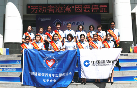 辽宁省分行在沈阳铁西支行营业部举办“劳动者港湾”揭牌仪式的场景,分行青年志愿者代表参加了仪式。
