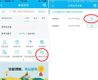 95333答:如您的基金交易账户状态均正常并开通我行手机银行,即可通过手机银行进行变更。操作步骤为:登录我行手机银行客户端,依次点击“投资理财-基金投资-交易账号变更”,选择需变更的账号,点击“变更”,按页面提示操作即可。