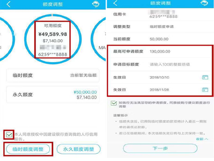 ①在信用卡菜单中选择“额度调整”,选择需要申请调额的卡片,勾选“同意授权”后,选择“临时额度调整;
