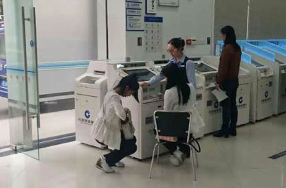 受台风“天兔”影响,天气转凉并伴有阴雨。2018年11月27日中午,一位女客户正在建行海关支行大堂等候区坐着排号办理业务,当轮到她前往智慧柜员机进行操作时,突然脸色苍白、额头冒汗。