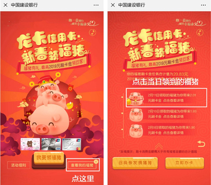 关注“龙卡信用卡”微信公众号,点击底部菜单“超值惠”-“新春领福猪”,进入活动页面。
