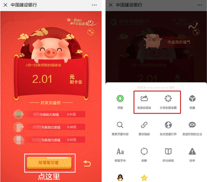 若领到有刷卡金任务的福猪,还可点击“给福猪加值”,请好友为自己助力获得更多刷卡金噢。