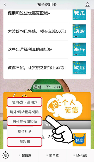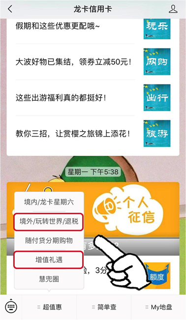 1.关注“龙卡信用卡”微信号,点击底部菜单“超值惠”