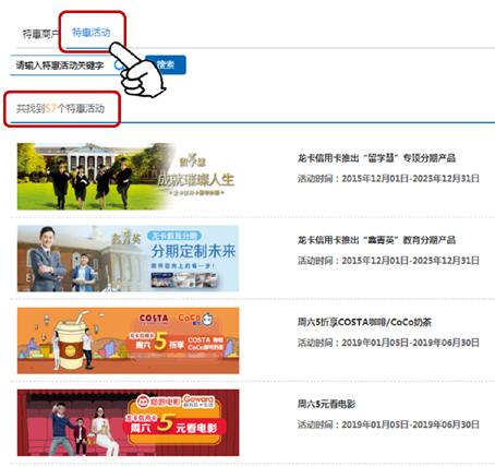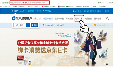 登录http://creditcard.ccb.com进入建行信用卡网站,点击首页“用卡优惠”-“特惠活动”,优惠信息一键搜罗。