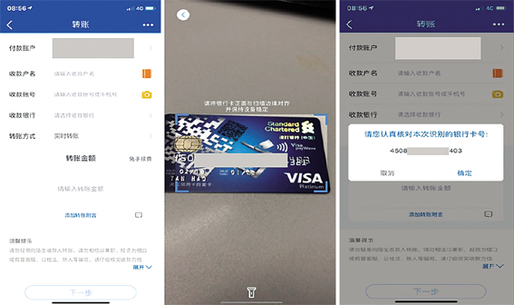 95533答:我行手机银行转账界面支持卡号识别,可在转账过程中扫描卡面自动识别并填入收款账号,具体流程为:登录最新版手机银行,选择“转账”进入功能菜单,在收款账号栏位右侧点击相机图标,根据提示扫描银行卡即可识别卡号。