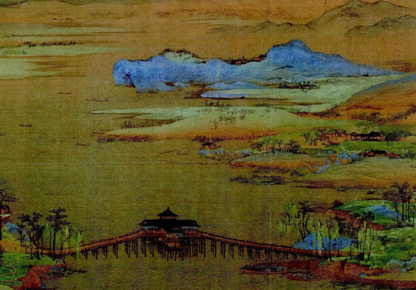 《千里江山图》是北宋时期的绢本设色画,全长11.88米,无款,据卷后蔡京题跋知系北宋王希孟所作,为中国十大传世名画之一,现收藏于北京故宫博物院。
