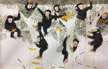 猴子和香蕉。三棵毗邻的香蕉树上画了9只形态各异的小猴子。它有着相同的黑色皮毛和喜不自胜的表情。有的一边爬树,一边吃香蕉。有的已经吃饱喝足,顽皮地将香蕉皮顶在脑袋上,用藤蔓将散落的香蕉连成项链形状挂在胸前。有的仿佛玩儿累了,趴在树杈上睡着了,睡梦中依旧泛着笑容。有的躲在粗壮树干的后面,嘴里叼着一根香蕉探头探脑,格外警惕。