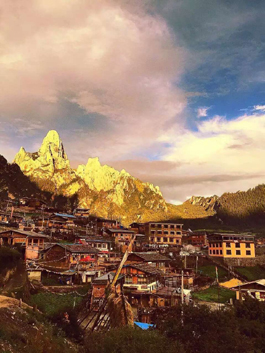 休整片刻,出门去随性地走走。刚好夕阳西下,斜射的阳光懒懒地透过厚厚的云层缝隙洒落下来,让周围的石头山披上了金色的霞光,再投射下来遮住半个山谷,光与影形成了鲜明的明暗对比,揉进轻轻飘起的炊烟,似仙境般如梦如幻。