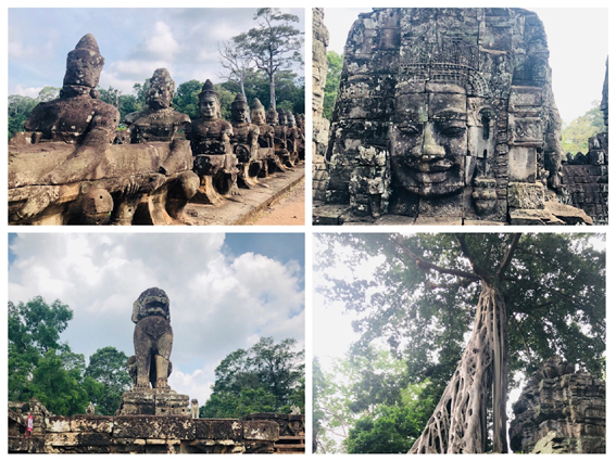 通王城曾经是吴哥王朝的首都,如今只留下城墙外廓。护城河两侧的神像制作精美,神态迥异,然而其中一些已遭损坏,如今所见多为后世修缮而成。在通王城中心的巴戎寺里,我欣赏到了著名的高棉的微笑,它以一种超越时空的神情疗愈着千百年来战争的疼痛。而在十二战象台,一匹石像昂扬着头,显示着往日的骄傲。十二生肖塔相传是当时的国王用来惩罚有罪臣子的地方,其刑罚之荒诞令人咋舌。随着夕阳渐下,当我在塔普伦寺里触摸着千年的老树根和坍塌的青石,凝视着巴肯山最后一抹落霞时,思绪早已渐渐走远。