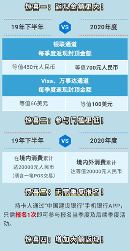 即日起至2020年12月31日,持卡人通过建行手机银行APP报名后,每季度使用名下龙卡信用卡在境内和境外消费累计达到等值20000元人民币,可有机会获得该季度境外使用指定龙卡信用卡线下POS刷卡交易消费金额8%返现的参与资格。若当季度境外使用龙卡信用卡单一通道线下POS刷卡交易消费金额超过等值30000元人民币,还可享受大额返现,超出等值30000元部分外享受该卡组织通道10%返现(各卡组织通道分别计算,可分别刷卡达标并享受)。每持卡人每季度返现封顶金额分别为:VISA通道100美元,万事达通道100美元,银联通道等值700元人民币。大额返现每持卡人每季度每个卡组织通道封顶金额等值1320元人民币。活动名额有限,先到先得。