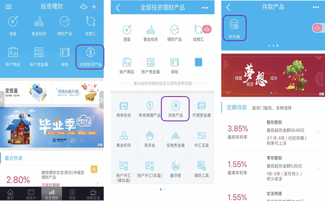 登陆手机银行→投资理财→全部投资产品→存款产品→积存通→积存通签约