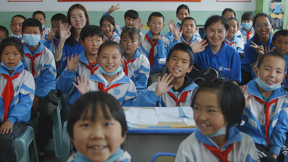 建行大学青海省分校联合北京市分校,在2020年暑期学子下乡实践活动中结对帮扶、实施“童语同音”计划,湟源县明德小学学生跟着学子学习普通话,助力“推普脱贫攻坚”。肖肖/摄