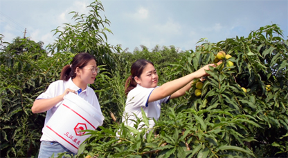 建行大学湖南省分校组织暑期下乡学子在常德市临澧县刻木山乡开展直播带货活动,学子正采摘黄桃。朱晓英/摄
