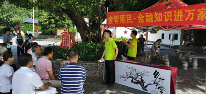 建行大学广东省分校下乡实践的学子们来到海丰县新山村,在社前广场的榕树下,用闽南语向村民介绍普惠金融服务、反非法集资、防金融诈骗等金融知识。穆歌/摄