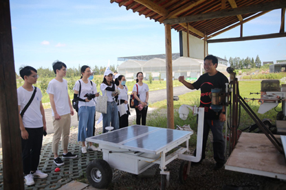 在金山区亭林镇,学子们走进农业专业合作社的智慧农场。农场主为下乡学子们详细介绍了机器人的各种功能,了解了无人种植的耕种新模式。农场主还分享了创业历程,以及普惠金融为农场发展带来的便利。